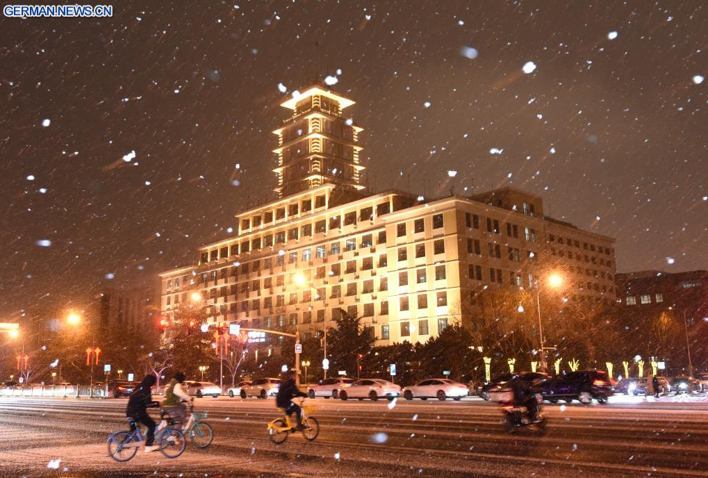 Bürger bahnen sich einen Weg durch den Schneefall in Chinas Hauptstadt Beijing, 17. Januar 2026. Am Freitag wurde Beijing vom Schneefall betroffen. (Quelle: Xinhua/Luo Xiaoguang)