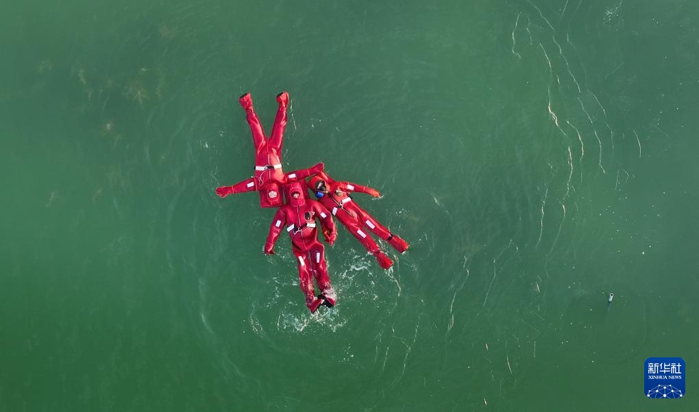Im Lanshan-Park der Stadt Lanzhou probieren Stadteinwohner ein sonderbares Programm aus: Dabei tragen sie Outfits, die wie Flusskrebse aussehen und warm halten, und schweben in eiskaltem Wasser. (Foto: Wang Peng/Xinhua)
