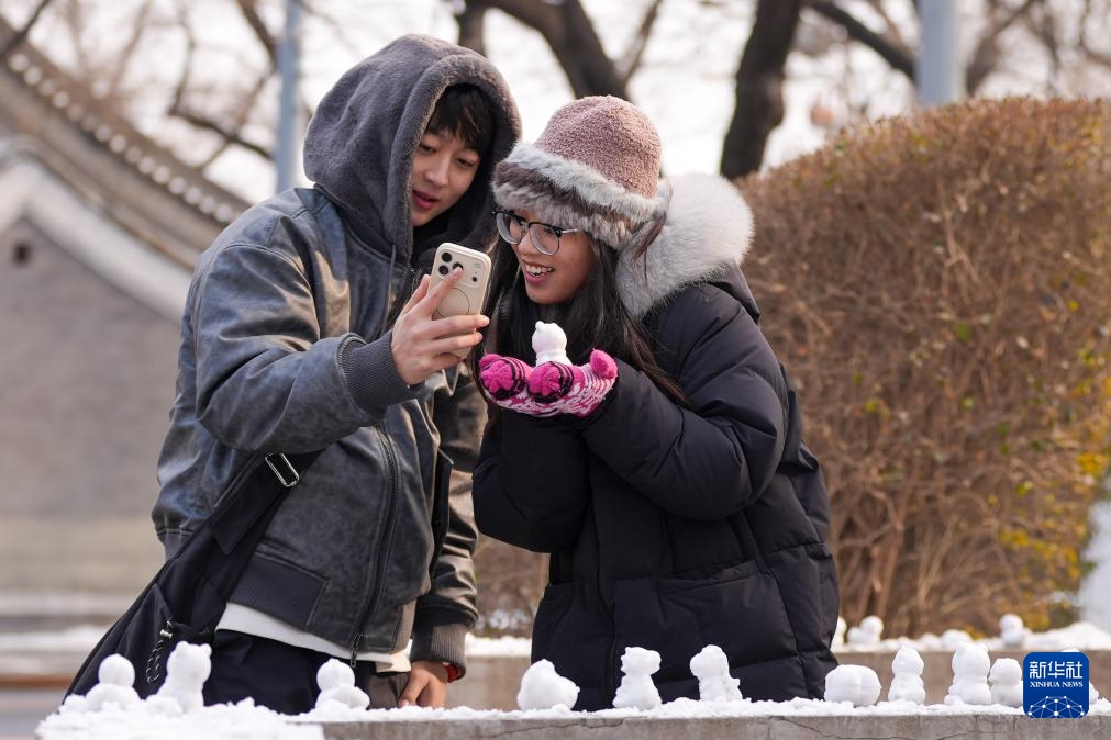 Das Foto zeigt kleine Schneemänner an einer Straße in Chinas Hauptstadt Beijing, 18. Januar 2026. (Quelle: Xinhua/Xie Han)