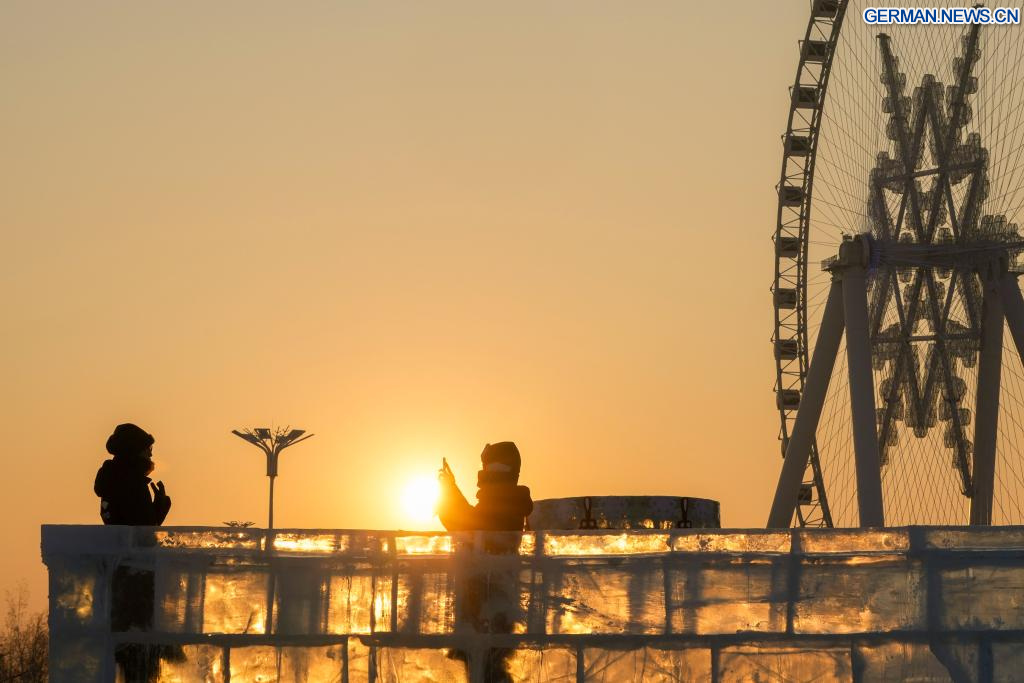 Touristen haben Spaß beim Sonnenuntergang in Harbin Ice-Snow World