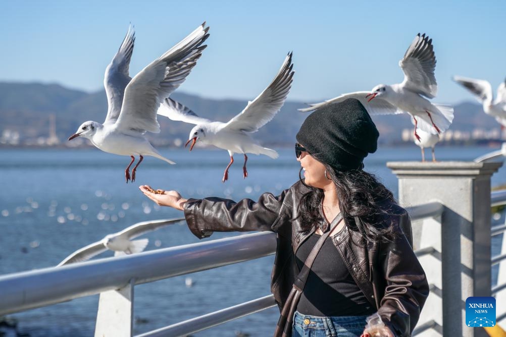 Eine Frau füttert Möwen am Dianchi-See. (22. Januar 2026, Xinhua)