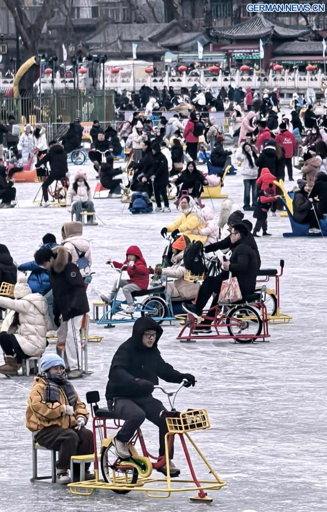 Menschen spielen auf zugefrorenem Shichahai-See in Beijing