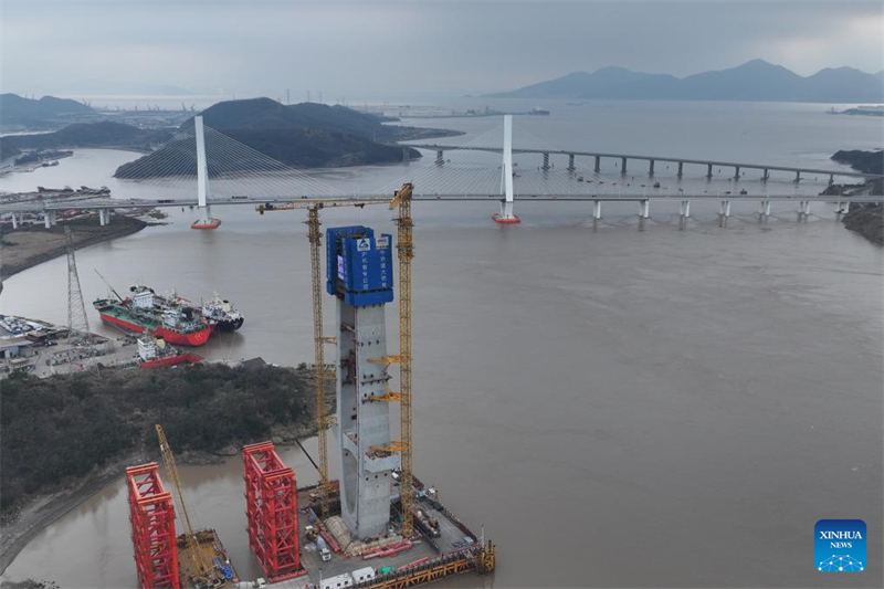 Eine am 25. Januar 2026 aufgenommene Drohnenaufnahme zeigt die Betonierstelle des Querträgers am östlichen Hauptturm der Fuchimen-Straßen-Zugbrücke an der Ningbo-Zhoushan-Eisenbahn in Zhoushan, Provinz Zhejiang, Ostchina. (Xinhua/Huang Zongzhi)