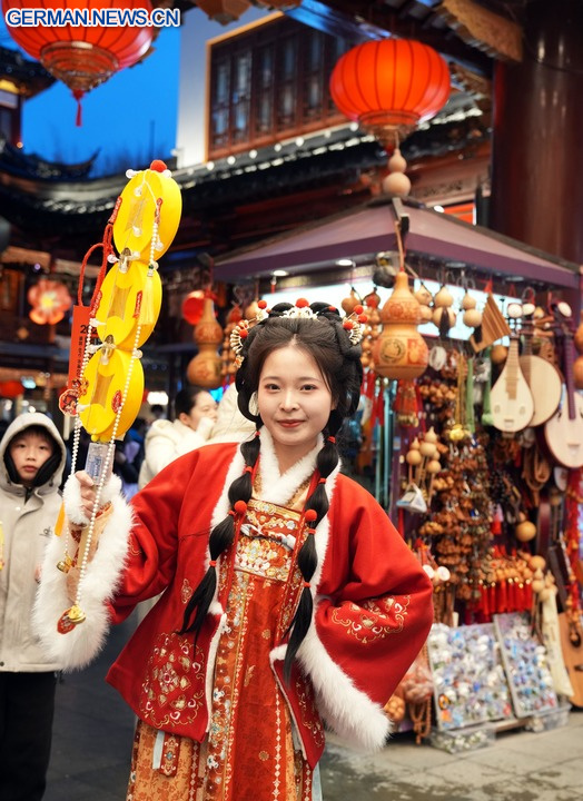 Das Foto zeigt eine Besucherin in traditioneller Tracht beim Yuyuan Garden Lantern Festival im Yuyuan-Garten in Shanghai in Ostchina, 26. Januar 2026. (Xinhua/Liu Ying)