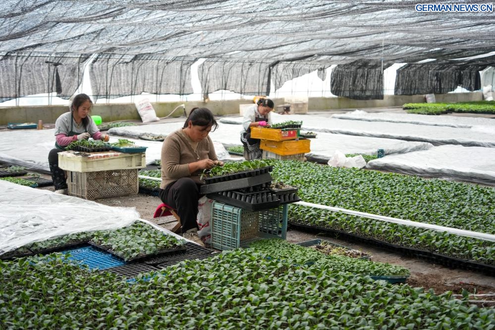 Bäuerinnen pfropfen Gemüsesetzlinge in einem Gewächshaus in der Gemeinde Yandian im Kreis Shenxian in der ostchinesischen Provinz Shandong, 28. Januar 2026. Als wichtiger Gemüselieferant verfügt Shenxian über eine Anbaufläche von mehr als 1 Million Mu (etwa 66.666,7 Hektar) und erreicht eine Jahresproduktion von 5,2 Millionen Tonnen. (Quelle: Xinhua/Xu Suhui)