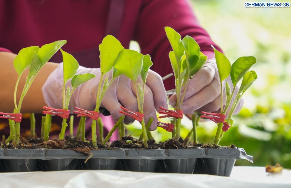 Bauern pfropfen Gemüsesetzlinge im Gewächshaus in Ostchinas Shandong