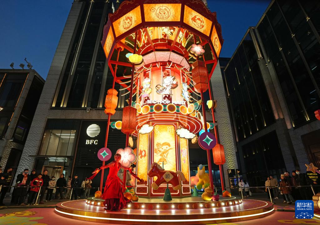 Am Abend des 1. Februar wurde im BFC Bund Financial Center ein Karussell in Form einer traditionellen Palastlaterne feierlich beleuchtet und damit die Frühlingsfest-Gartenaktivierung eingeläutet. (Foto vom 1. Februar, Liu Ying/Xinhua)