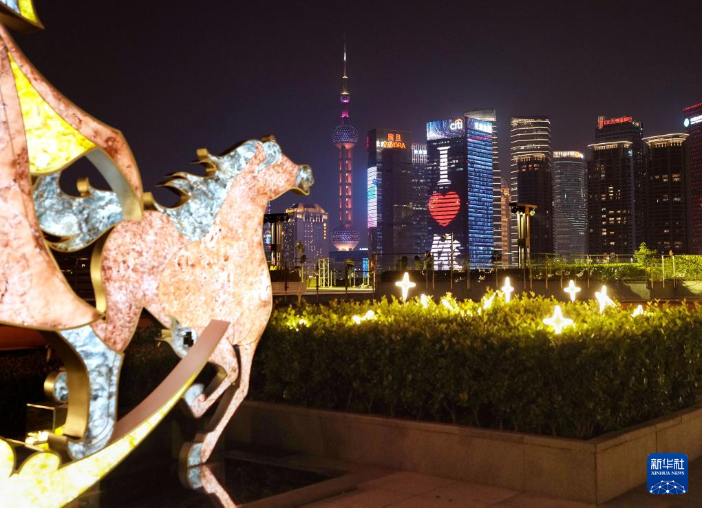 Pferde-förmige Laternen auf der Terrasse des BFC Bund Financial Centerbilden einen harmonischen Kontrast zur nächtlichen Skyline des Huangpu-Flusses. (Foto vom 1. Februar, Liu Ying/Xinhua)