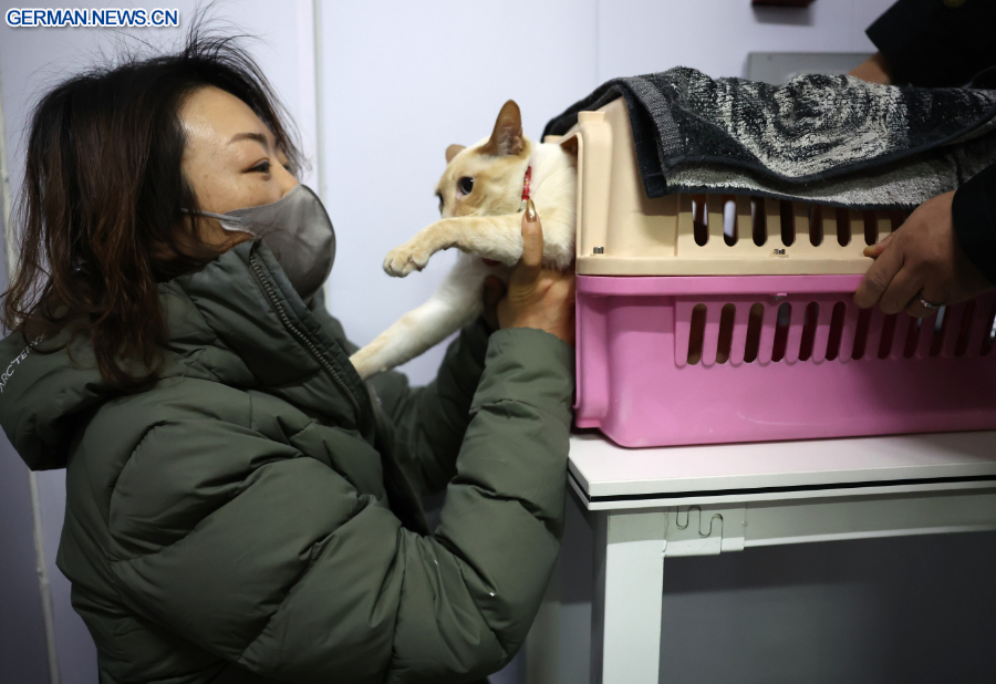 Das Foto zeigt eine Passagierin und ihre Katze im Bereich für die Übergabe von Haustieren des China Railway Express am Westbahnhof von Lanzhou in der Provinz Gansu im Nordwesten Chinas. (Foto vom 26. Januar 2026, Xinhua/Chen Bin)