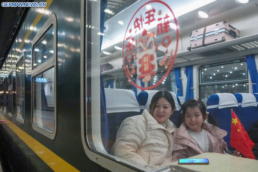 Das Foto zeigt die siebenjährige Xixi (rechts) zusammen mit ihrer Mutter im Zug Nr. K4069 am frühen Morgen im Westbahnhof der chinesischen Hauptstadt Beijing vor der Rückreise zum Frühlingsfest in ihre Heimatstadt Zhoukou in der zentralchinesischen Provinz Henan, 2. Februar 2026. (Xinhua/Ju Huanzong)