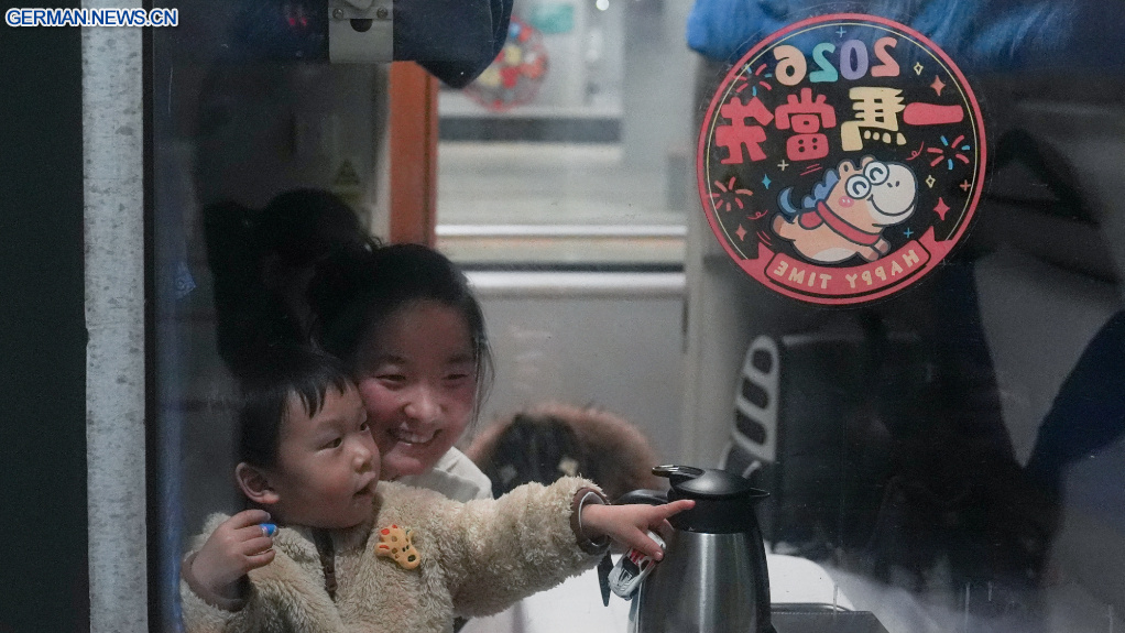 Das Foto zeigt eine Mutter mit ihrem zweijährigen Kleinkind im Zug Nr. K4069 am frühen Morgen im Westbahnhof der chinesischen Hauptstadt Beijing vor der Rückreise zum Frühlingsfest in ihre Heimatstadt Fuyang, 2. Februar 2026. (Xinhua/Ju Huanzong)