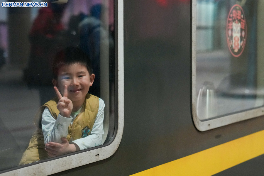 Das Foto zeigt ein posierendes Kind, das mit seiner Familie reist, im Zug Nr. K4069 am frühen Morgen im Westbahnhof der chinesischen Hauptstadt Beijing, 2. Februar 2026. (Xinhua/Ju Huanzong)