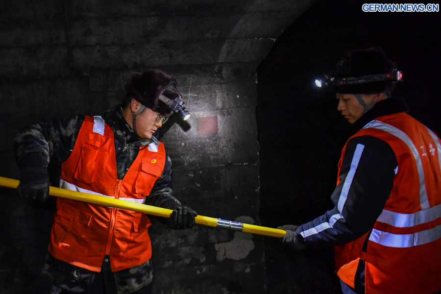 Techniker bereiten sich auf das Abschlagen von Eis in einem Eisenbahntunnel in der Provinz Shanxi in Nordchina vor, 3. Februar 2026. (Xinhua/Cao Yang)