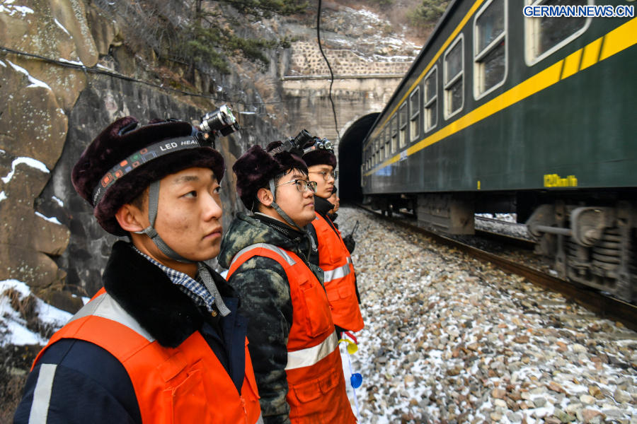 Mitglieder einer Wartungsmannschaft warten während der Durchfahrt eines Zuges in der Provinz Shanxi in Nordchina, 3. Februar 2026. (Xinhua/Cao Yang)