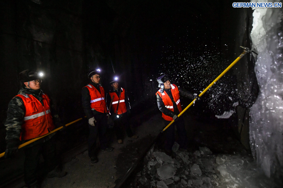 Der Leiter einer Wartungsmannschaft (erster von rechts) demonstriert Techniken zum Eisbrechen in einem Eisenbahntunnel in der Provinz Shanxi in Nordchina, 3. Februar 2026. (Xinhua/Cao Yang)