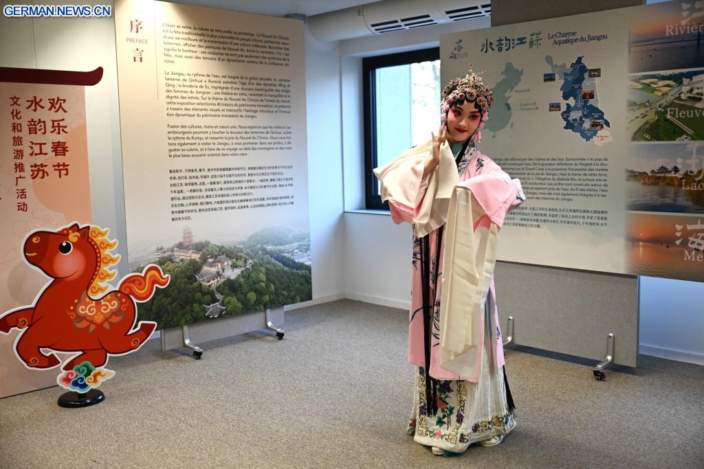 Eine Künstlerin führt die Kunqu-Oper während einer Werbeveranstaltung für Kultur und Tourismus der ostchinesischen Provinz Jiangsu im China Cultural Center in Luxemburg auf, 7. Februar 2026. (Quelle: Xinhua/Lyu You)