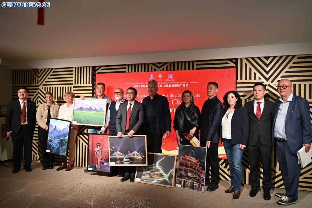 Gäste überreichen luxemburgischen Touristen den Fotografiepreis für die Fotos, die sie in China aufgenommen haben, auf einer Werbeveranstaltung für Kultur und Tourismus der ostchinesischen Provinz Jiangsu im China Cultural Center in Luxemburg, 7. Februar 2026. (Quelle: Xinhua/Lyu You)