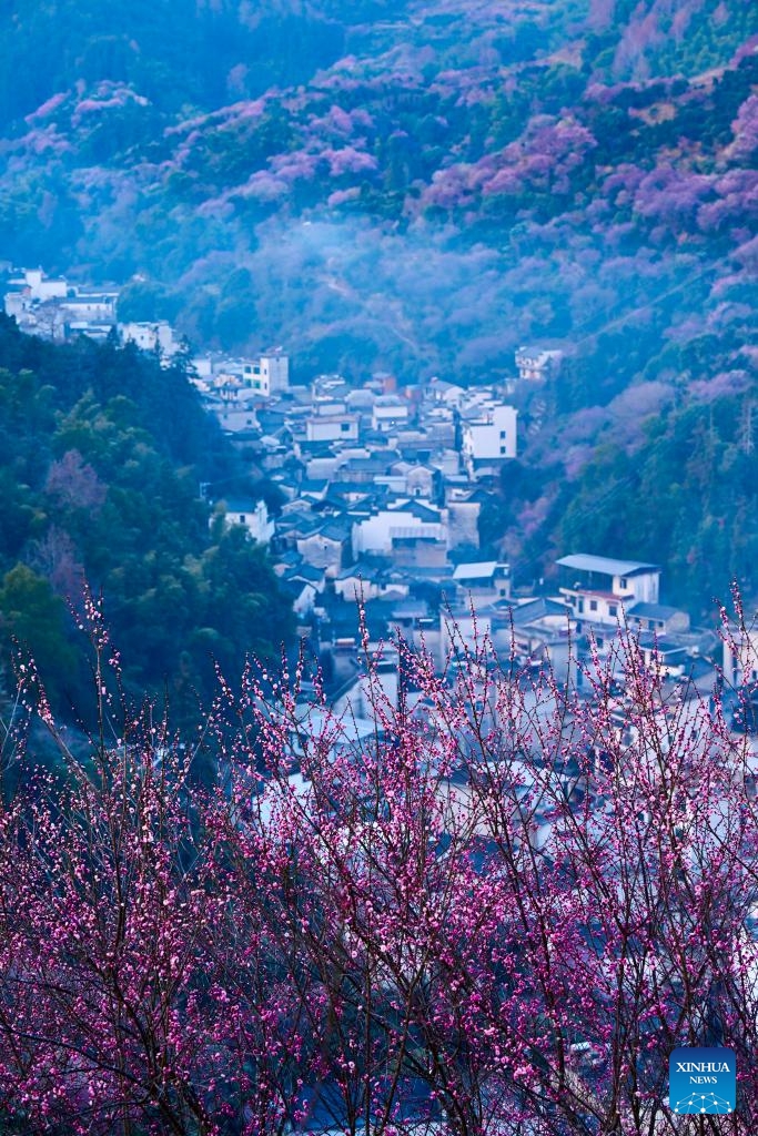 Das Foto zeigt die Landschaft des Dorfes Maihuayu im Kreis Shexian in der ostchinesischen Provinz Anhui inmitten der Pflaumenblüten. (9. Februar 2026, Xinhua)