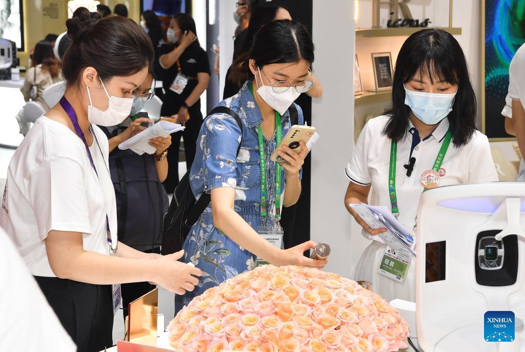 Besucher sehen sich auf der zweiten China International Consumer Products Expo Exponate am Stand von L‘Oreal. (Foto vom 27. Juli 2022, Xinhua)