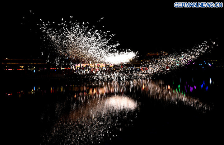 Bei einem Tempelfest in der Stadt Shangqiu in der zentralchinesischen Provinz Henan wird ein Feuerwerk aus geschmolzenem Eisen gezündet, 19. Februar 2026. (Xinhua/Zhu Xiang)