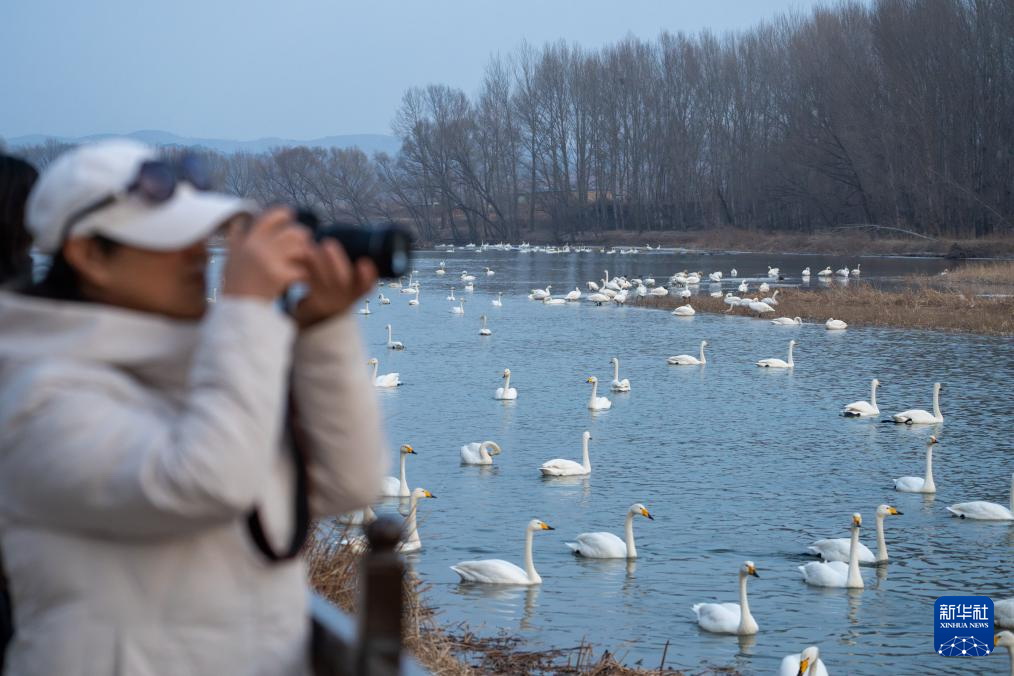 Eine Touristin fotografiert die überwinternden Vögel am Ufer des Daling-Flusses. (Foto: Hu Jingwen/ Xinhua)
