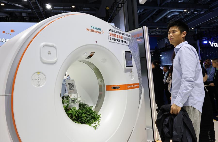 Besucher betrachten ein Dualquellen-Photonenzähler-CT-Gerät von Siemens, das in Asien seine Premiere feierte, während der China International Import Expo (CIIE) in Shanghai am 6. November 2025. (Foto: Xinhua/Fang Zhe)