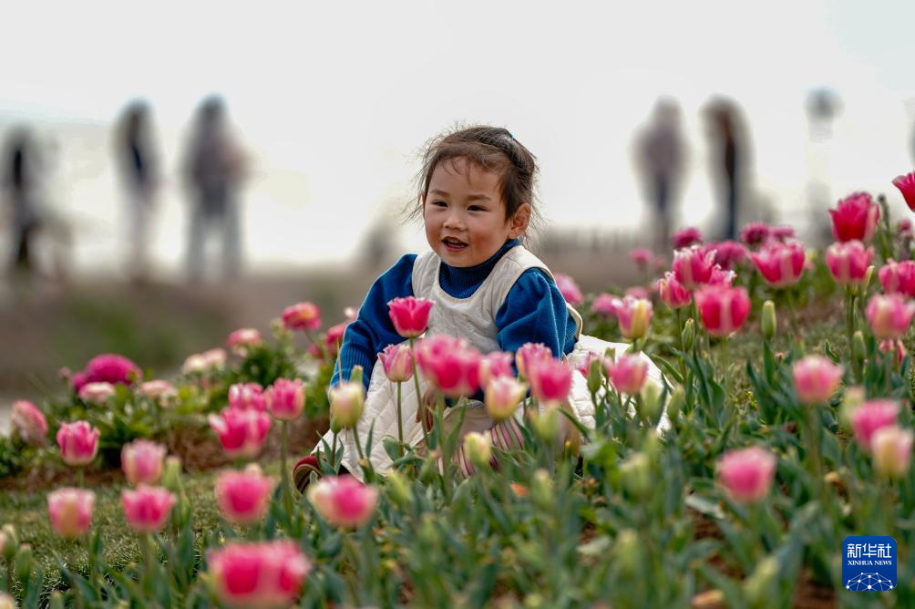 Ein Mädchen posiert in den prächtigen Tulpenbeeten am Seeufer. (Foto: Chen Xinbo/ Xinhua)