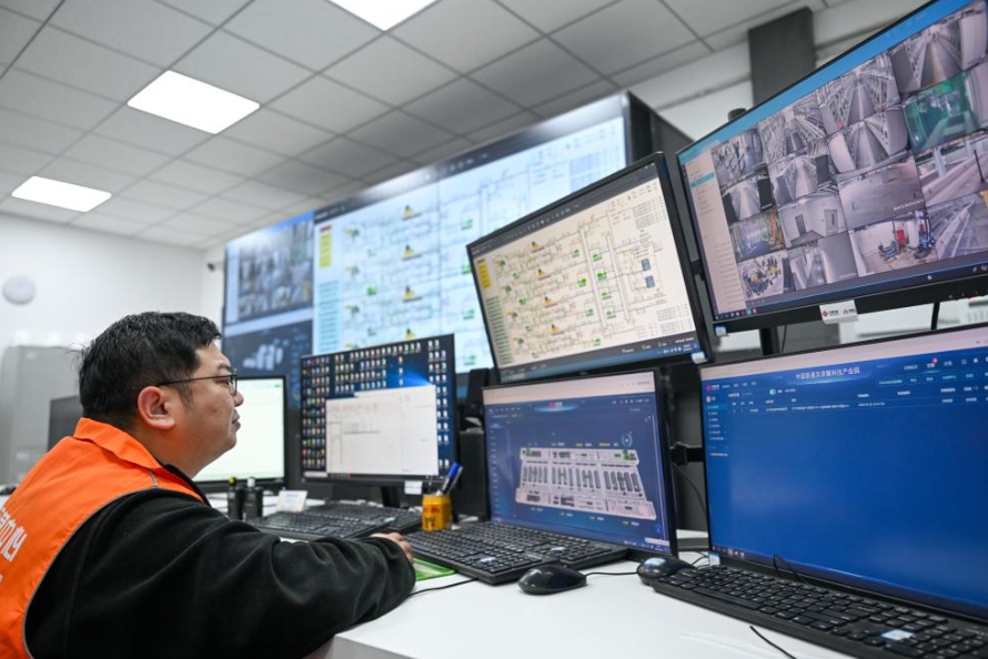 Ein Ingenieur überprüft den Betriebsstatus von Servern in einem Industriepark für digitale Technologien von China Unicom im Beijing-Tianjin Industrial New City Gaocun Data Intelligence Innovation Park im nordchinesischen Tianjin, 26. Februar 2026. (Quelle: Xinhua/Sun Fanyue)