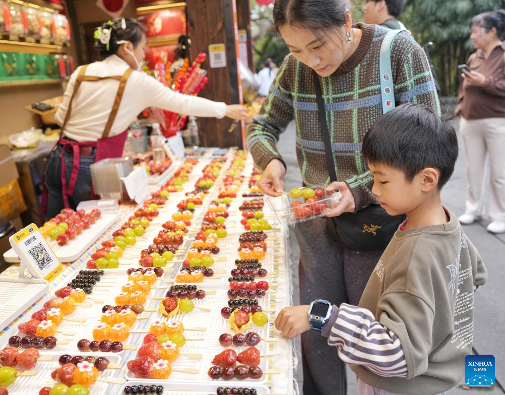Menschen wählen kandierte Früchte an einem Stand auf einem Tempelmarkt im Wuhou-Tempel in Chengdu. (Foto vom 27. Februar 2026, Liu Kun/Xinhua)