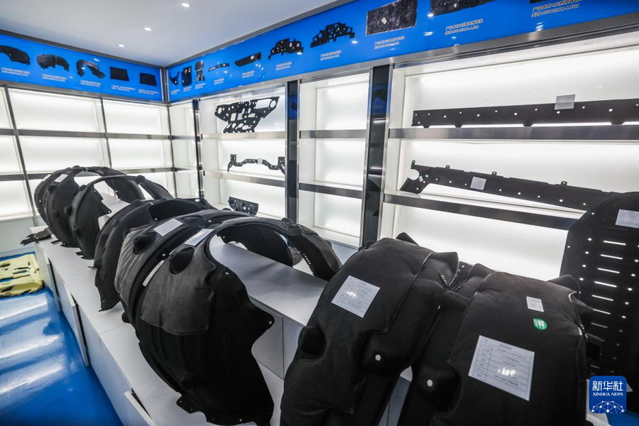 Ein Blick in den Ausstellungsraum zeigt Schutzabdeckungen für moderne Elektrofahrzeuge. (Foto: Xu Yu/ Xinhua)