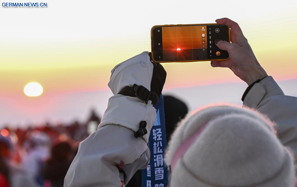 Eine Skibegeisterte macht Fotos vom Sonnenuntergang im internationalen Skigebiet Jiangjunshan in der Präfektur Altay des nordwestchinesischen Uigurischen Autonomen Gebiets Xinjiang, 25. Februar 2026. (Quelle: Xinhua/Wang Fei)