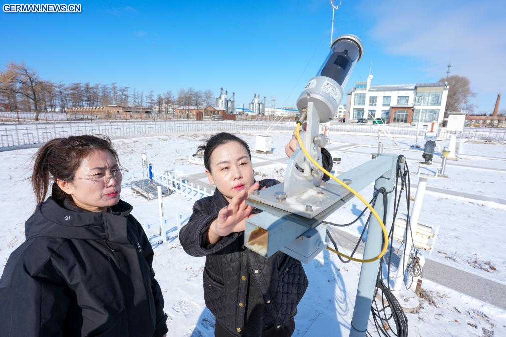 Mitarbeiterinnen führen Wartungsarbeiten an Geräten in einer Wetterstation der Youyi Farm Co., Ltd. der Beidahuang Group in der Stadt Shuangyashan in der nordostchinesischen Provinz Heilongjiang durch, 28. Februar 2026. (Quelle: Xinhua/Wang Song)