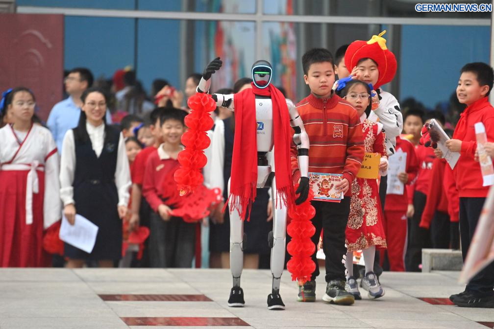 Technik trifft Tradition: Schülerinnen und Schüler einer Grundschule im autonomen Gebiet Guangxi der Zhuang in Nanning überbringen gemeinsam mit einem humanoiden Roboter Neujahrsgrüße zur feierlichen Semestereröffnung am Montag. (Foto: Xinhua/Huang Xiaobang)