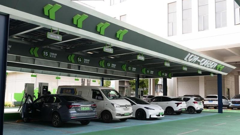 Dieses Foto zeigt eine Ladestation, die von einer Solaranlage in einem Industriegebiet in der ostchinesischen Provinz Jiangsu betrieben wird. [Foto vom 17. April 2025/Xinhua]