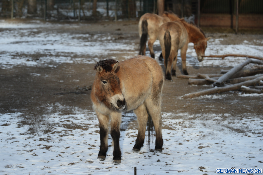 Das Przewalski-Pferd, die einzige noch lebende Wildpferdeart der Welt, blickt auf eine mehr als 60 Millionen Jahre lange Evolutionsgeschichte zurück. „Sie mögen Blätter sehr gerne“, erklärte Martin Kränzlin, Säugetier-Kurator des Tierparks, gegenüber Xinhua. Ein Tierpfleger schiebt einen Wagen langsam über den Schnee, hält am Rand der Herde an und fügt Bündel um Bündel Heu, frische Äste und sogar einen Weihnachtsbaum hinzu.