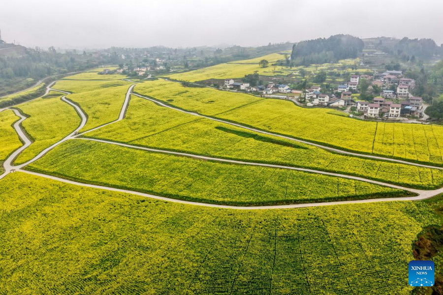 Das Rapsblütenfeld im Dorf Xiucai aus der Vogelperspektive. (Foto vom am 7. März 2026, Xinhua/Tang Yi)