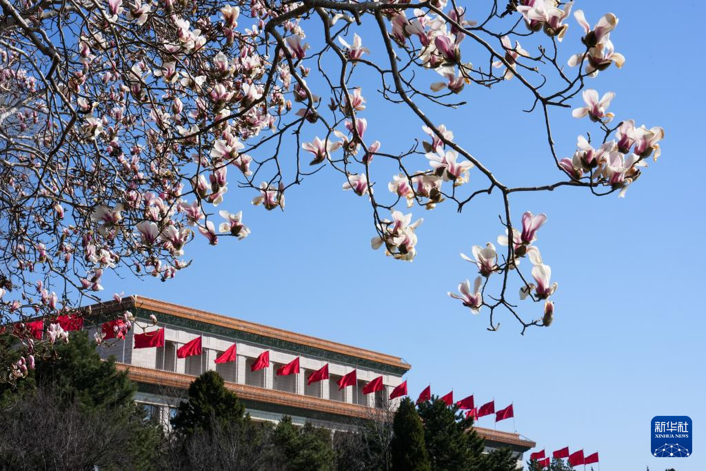 Die Magnolien blühen vor dem Nationalen Zentrum für Darstellende Künste. (Foto vom 9. März 2026, Ju Huanzong/Xinhua)