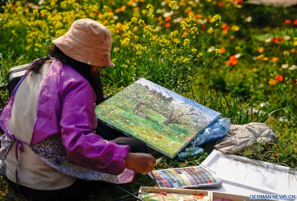 Eine Frau malt in einem Garten in Kunming. (10. März 2026, Xinhua)