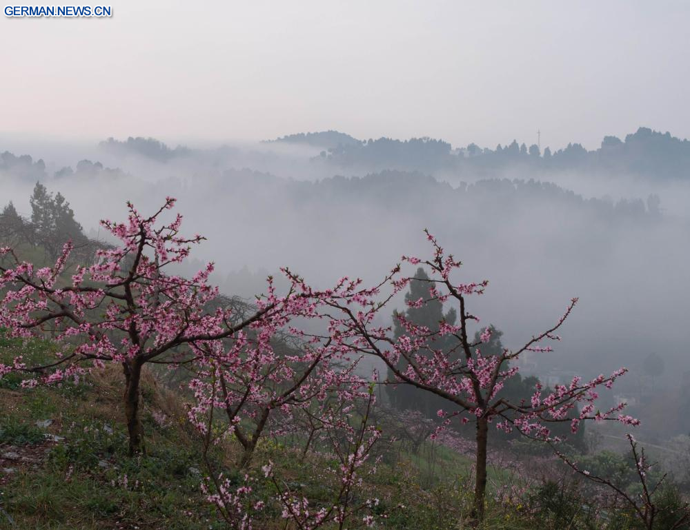 Blick auf Pfirsichblüten in Chengdu in Chinas Sichuan