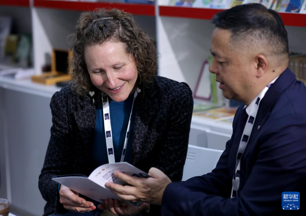 Menschen führen im chinesischen Ausstellungsbereich der Londoner Buchmesse Gespräche. (Foto vom 30. März 2026, Li Ying/Xinhua)