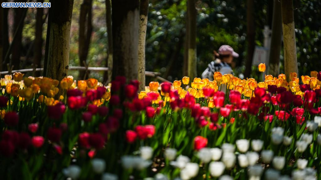 Eine Touristin bewundert Tulpen im Longjiashan-Nationalwaldpark im Kreis Longli in der südwestchinesischen Provinz Guizhou, 12. März 2026. (Quelle: Xinhua/Tao Liang)