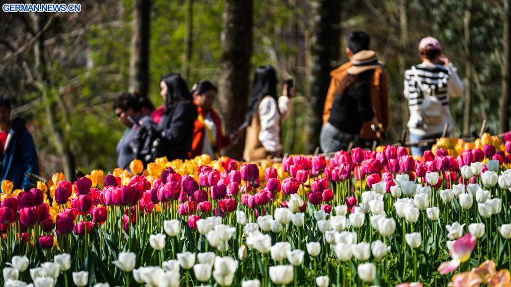 Touristen betrachten Tulpen im Park im Kreis Longli in Chinas Guizhou