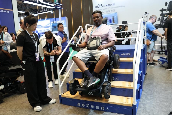 Ein Mann testet einen Rollstuhlroboter im Bereich für intelligente Gesundheitsversorgung auf der 138. Canton Fair in Guangzhou in der südchinesischen Provinz Guangdong. (Foto vom 31. Oktober 2025, Lu Hanxin/Xinhua)