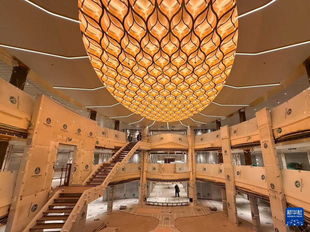 Eine Innenaufnahme des zweiten in China gebauten großen Kreuzfahrtschiffs „Adora Flora City“. Die Innenausbauarbeiten sind noch im Gange. (Fotos vom 16. März 2026, Ding Ting/Xinhua)