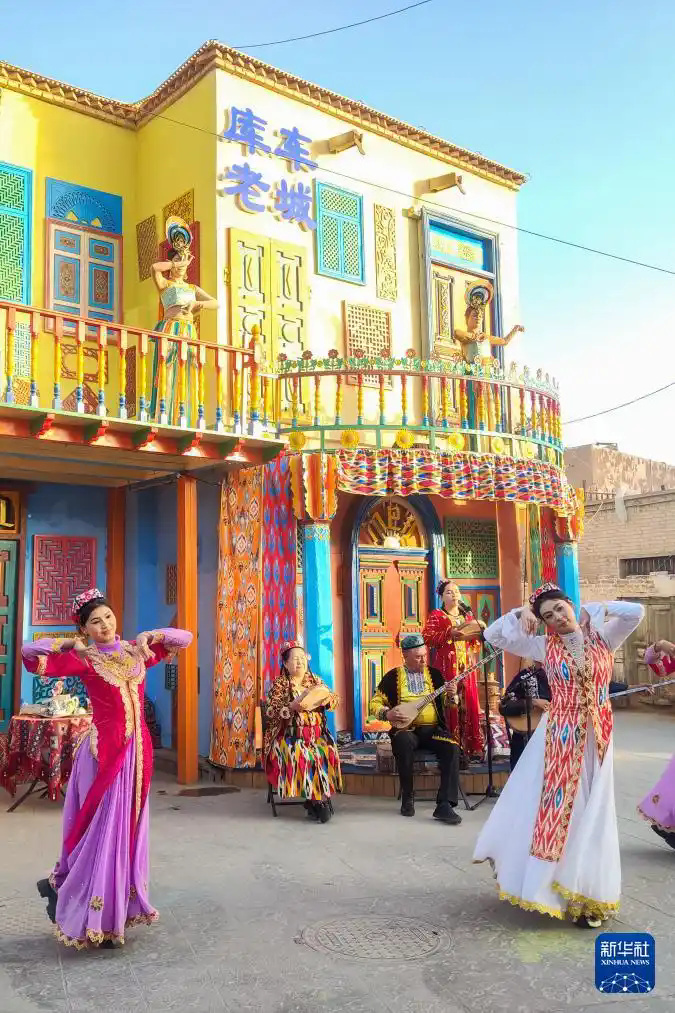 Künstler treten in der Blumenhut-Gasse in der Stadt Kuqa auf. (Foto vom 10. November 2025, Xinhua/Guan Qiaoqiao)