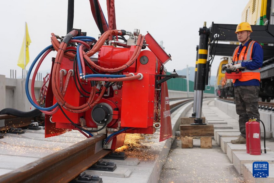 Techniker bedienen die neue hybride Abbrennstumpf-Schienenschweißmaschine auf der Baustelle der Hangzhou-Deqing-Linie. (Foto: Huang Zongzhi)