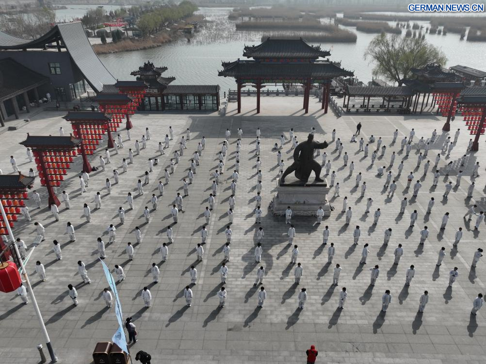 Die Luftaufnahme einer Drohne vom 21. März 2026 zeigt eine Massenvorführung von Taijiquan, einer traditionellen chinesischen Kampfkunst, im Bezirk Yongnian in der Stadt Handan in der nordchinesischen Provinz Hebei. (Quelle: Xinhua)