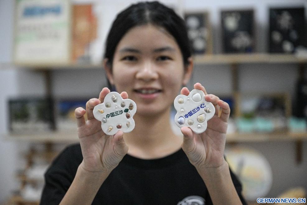 Eine Stadtbewohnerin zeigt selbstgemachte Kühlschrankmagnete in einem Geschäft auf der Insel Zhaoshu in Sansha in der südchinesischen Provinz Hainan, 19. März 2026. (Quelle: Xinhua/Pu Xiaoxu)