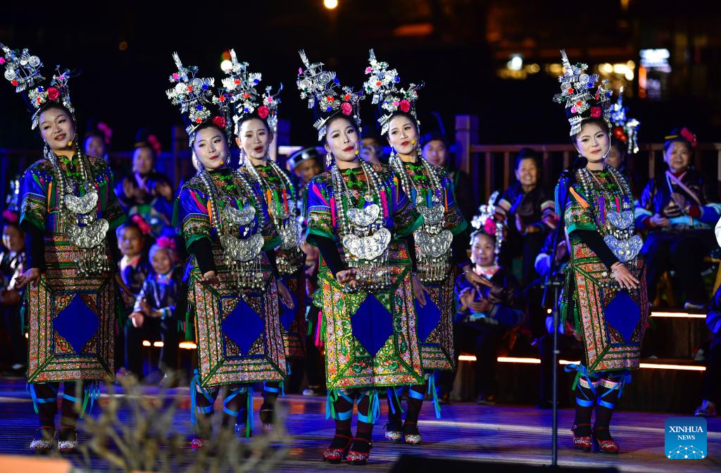 Mitgliederinnen eines lokalen Chors singen ein großes Lied der Dong-Volksgruppe im Dong-Dorf Zhaoxing im Kreis Liping in der südwestchinesischen Provinz Guizhou. (Foto vom 23. März 2026, Yang Wenbin/Xinhua)