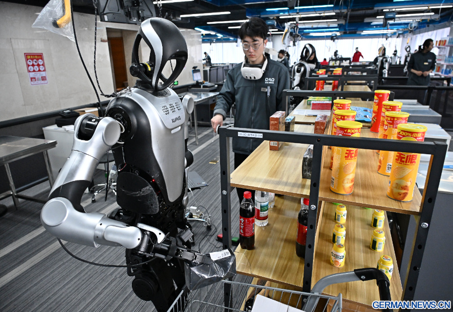 Das Foto zeigt einen Mitarbeiter bei Trainingsmaßnahmen und Datenerhebungen an einem humanoiden Roboter im Qingdao Humanoid Robot Data Training Center im Stadtbezirk Laoshan von Qingdao in der Provinz Shandong in Ostchina, 23. März 2026. (Xinhua/Li Ziheng)